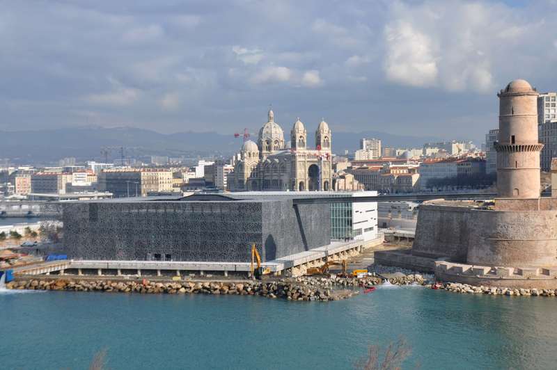 Œuvre de l'architecte Rudy Ricciotti associé à Roland Carta, le MuCEM a coûté 191 millions d'euros. Il a été édifié sur l'ancien môle portuaire J4 et accueille sur 15.700 m² deux plateaux: une « galerie de la Méditerranée », qui propose de découvrir les étapes majeures des civilisations méditerranéennes, et jusqu'en janvier 2014 deux expositions temporaires: « Le noir et le bleu, un rêve méditerranéen » et « Au bazar du genre, féminin-masculin en Méditerranée ».