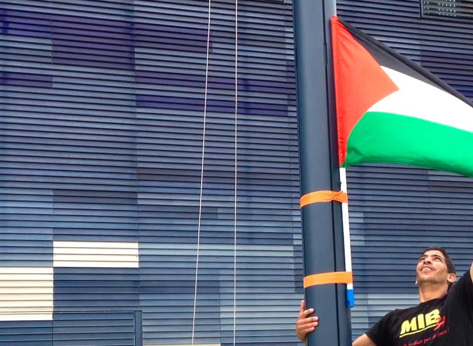 La polémique sur le drapeau de la Palestine que la municipalité a tardé jusqu'ici à dresser, cinq mois après le jumelage de Montpellier à la ville palestinienne de Bethléem (au privilège de l'étendard communal), étant bien présente en toile de fond de cette action, les manifestants ont ensuite quitté Grammont pour se rendre au nouvel hôtel de Ville de Montpellier, afin d'y dresser enfin, symboliquement, ledit drapeau palestinien. Avec en tête, les récentes déclarations de Richard Prasquier, le Président du CRIF (Conseil représentatif des Institutions juives), qui, comme l'a rapporté Midi Libre (08.06.12), a émis une « remarque critique » contre l'annonce effectuée par des représentants d'Hélène Mandroux, concernant le remplacement prochain du drapeau de Bethléem par celui de la Palestine.