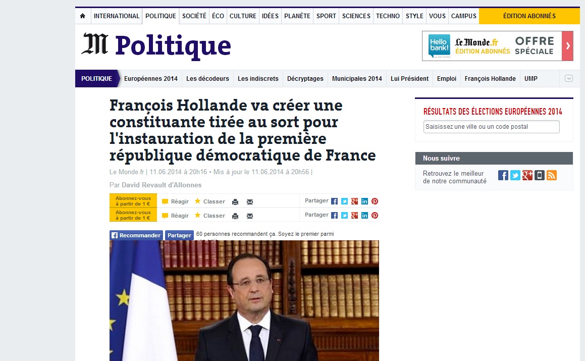 « François Hollande va créer une constituante tirée au sort pour l'instauration de la première république démocratique de France ». Datée du 11 juin 2014, à 20h16, et revêtant presque toutes les apparences du journal Le Monde, cette information que vous pouvez lire ici pendant encore quelques heures (et pour l'éternité ci-dessous), est bien une vraie-fausse information, sur laquelle la communauté du site hoaxbuster.com, spécialisé dans ce domaine, s’attelle déjà ici.