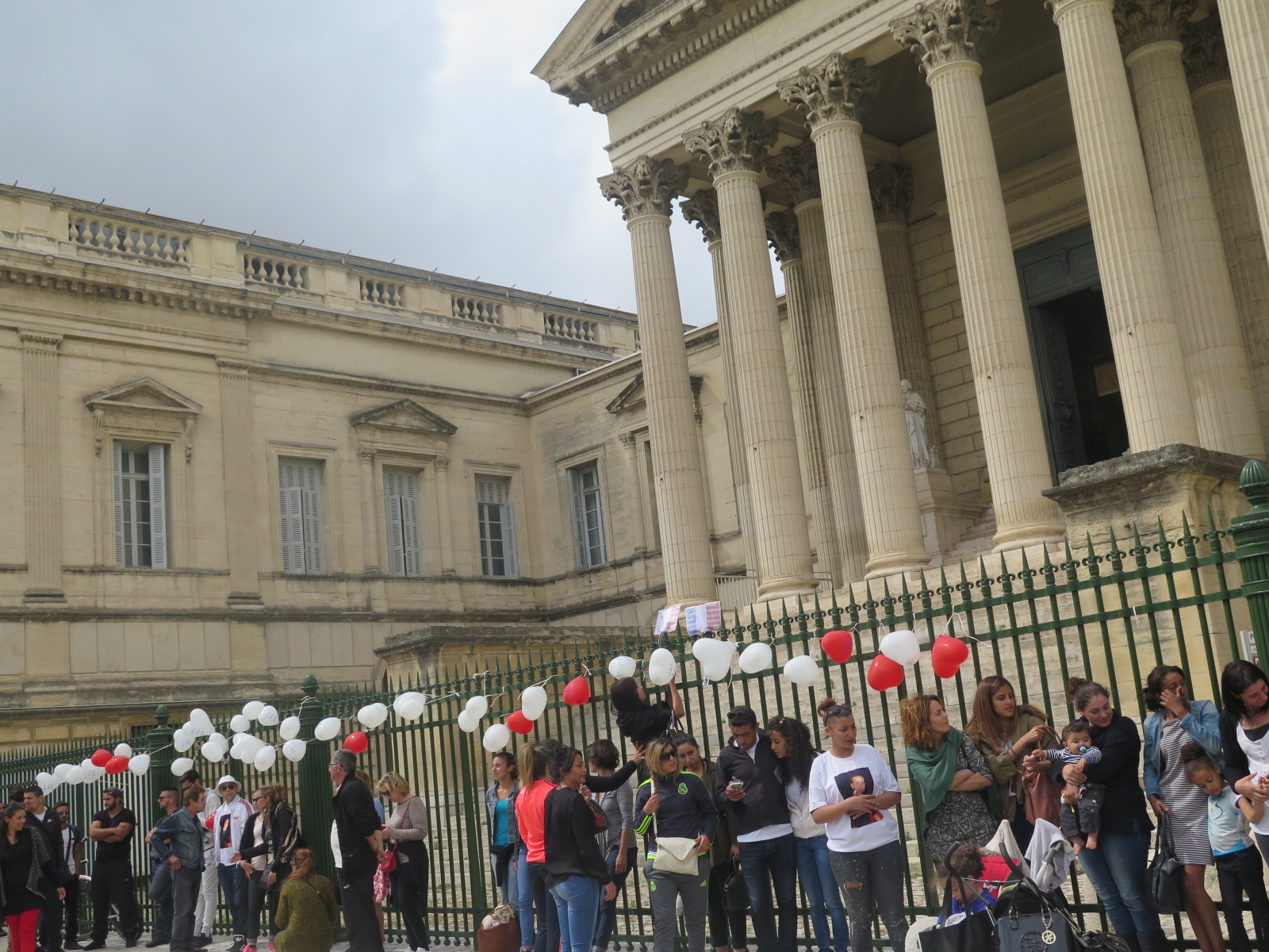 Quelques minutes auparavant, tout le monde s’était affairé à accrocher quelques ballons aux grilles du palais avec écrit dessus « Justice Pour Salah ». Il y avait deux pancartes aussi, aux couleurs bleu- blanc-rouge. Deux pancartes plus compliquées à accrocher à l’aide d’un fil noué sur un barreau que des ballons emplis d’oxygène. Jusqu’à ce que Hakim Sleiman ne se lève, la mémoire de son fils emplie dans la tête, pour enquiller d’un simple coup l’une d’entre-elles sur le haut de la grille métallique de protection du tribunal qui ressemble étrangement à un couteau... Là, ça tient et bien droit, plus rien ne bouge.