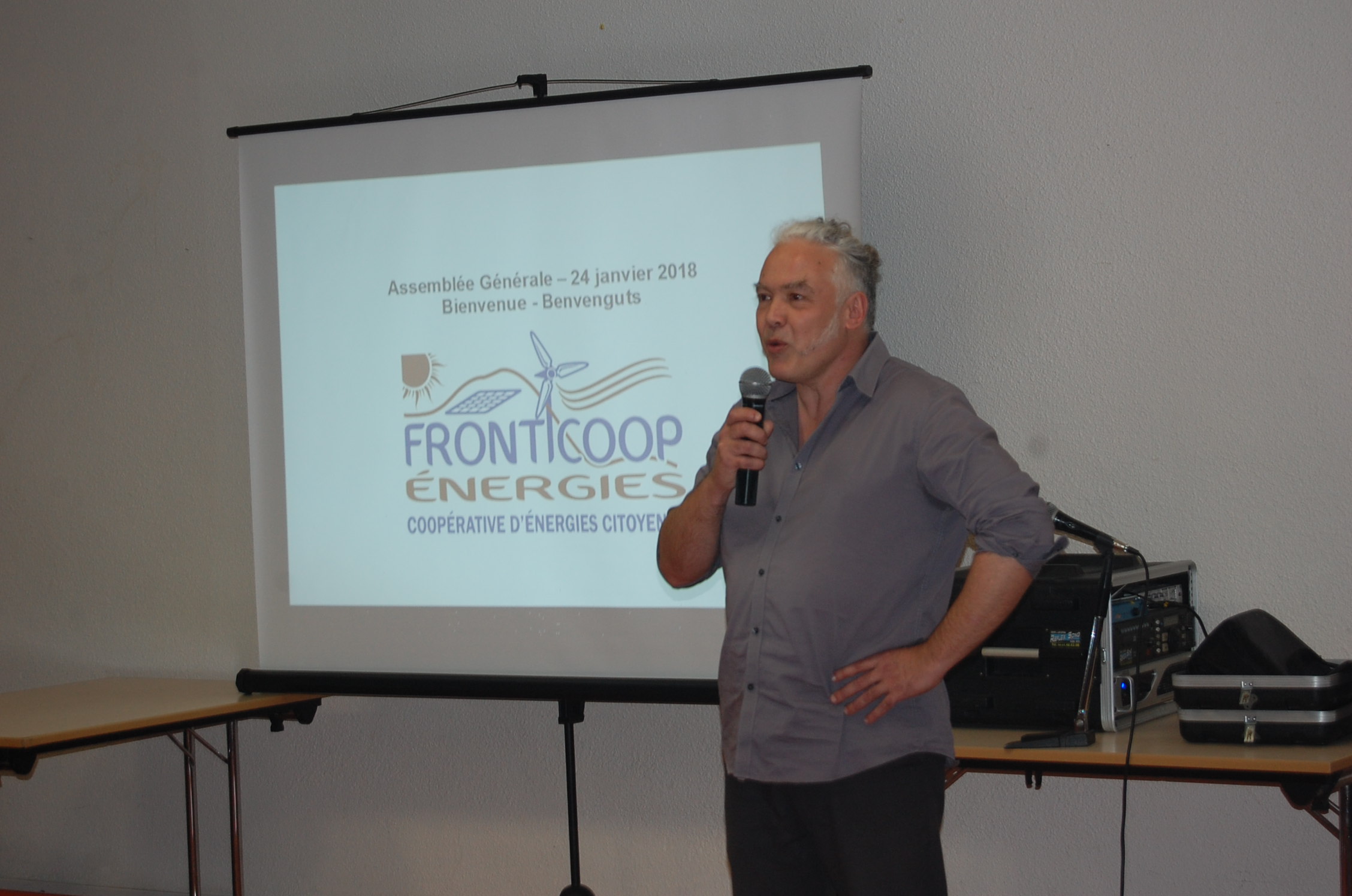 Sylvain De Smet, son président, s’est fait l’interprète de toutes les actions de l’association, depuis son démarrage avec un petit groupe de 11 personnes, le 16 juin 2016. "Après, tout est allé très vite", a-t-il reconnu, grâce au travail de tous pour impulser un dynamisme local sur les questions énergétiques à travers l’élaboration de projets pour favoriser les énergies citoyennes, la coopérative montée en mars 2017 étant au cœur de toutes ces actions. Du coup les adhérents étaient au nombre de 80 en octobre 2016, ce qui a permis la présence de Fronticoop en de nombreux endroits pour se faire connaître.