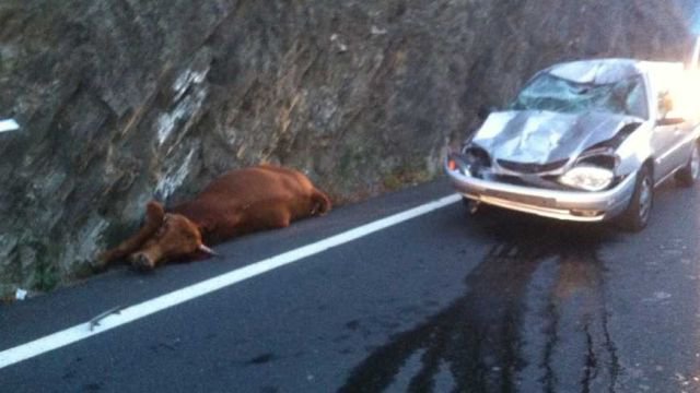 Vous vous imaginez sur la route au volant de votre voiture avec une vache qui tombe tout à coup d’une falaise sur votre capot, sans même le temps d’un « mais » ou d’un « meuh » ? C’est ce qui est arrivé ce lundi matin sur la départementale 900 au Perthus à proximité du CCOD, Centre de coopération policière et douanière, dans les Pyrénées-Orientales.